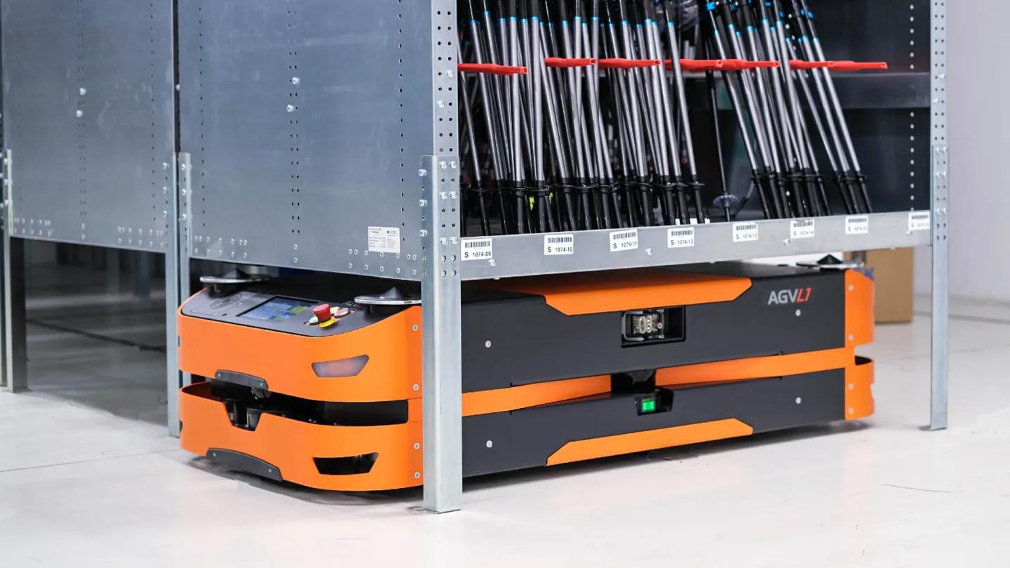 Für den Transport der Racks kommen mobile Transportroboter von SAFELOG zum Einsatz. Mit einer Höhe von nur 340 mm eignen sich diese fahrerlosen Transportfahrzeuge zum Unterfahren der Regale ebenso wie für den Transport von Paletten oder Gitterboxen. Das Gewicht des Topload kann dabei bis zu 1.500 kg betragen.